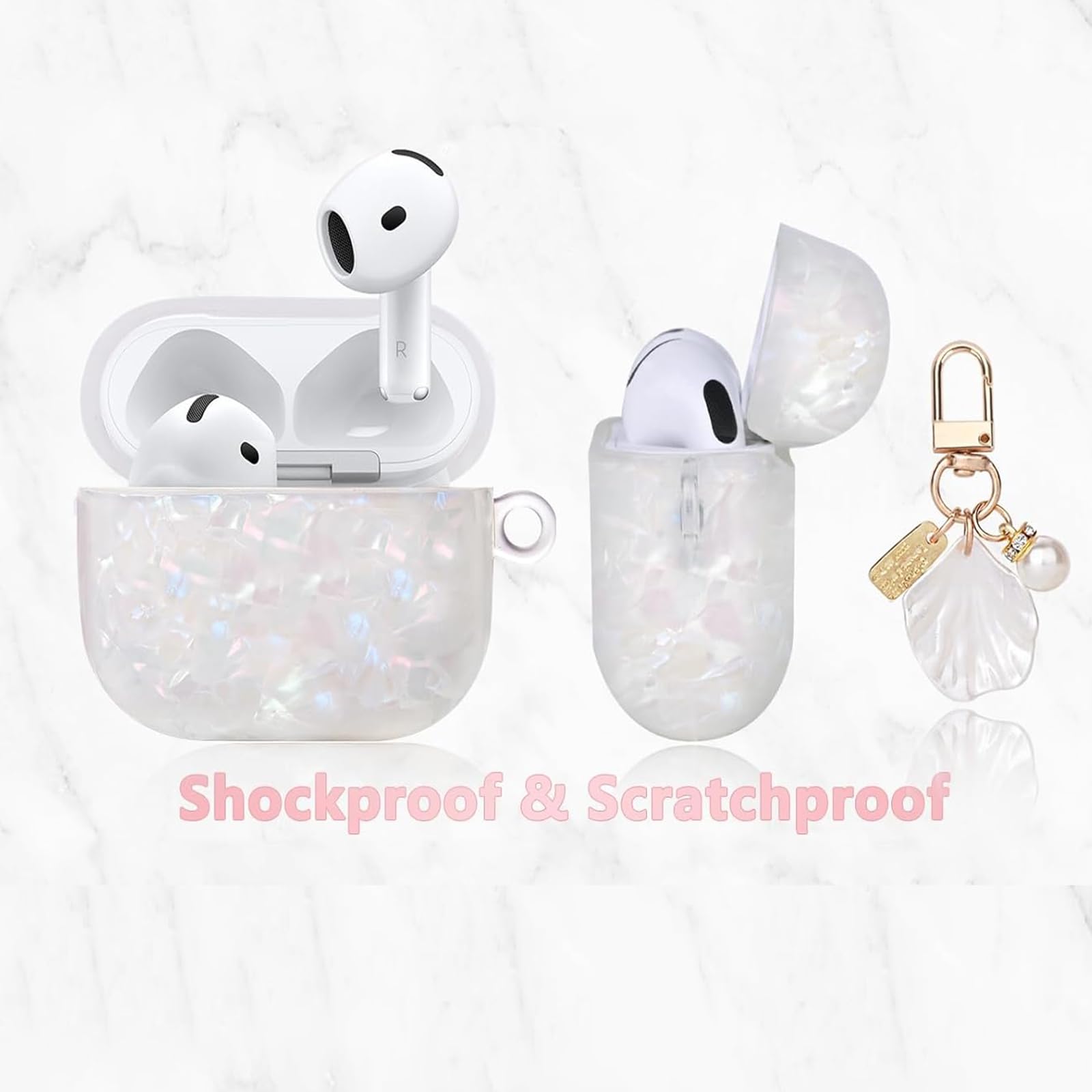 LUVI Compatible with AirPods 4 Cute Case with Shell Pearl Keychain Bling Glitter Shiny Sparkle Marble Design Wireless Charging Luxury Skin Cover for Girls Womenâ