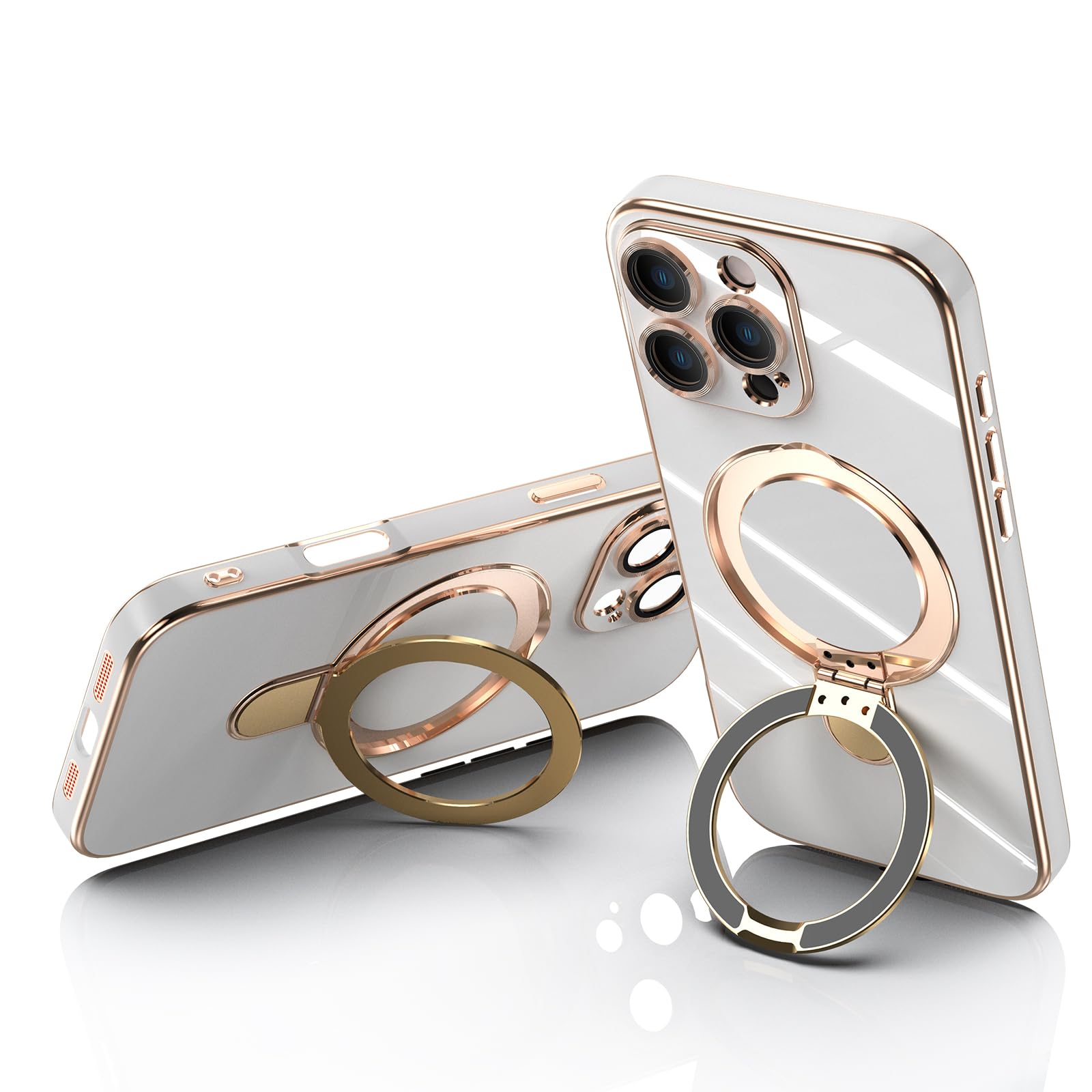 LUVI Compatible with iPhone 16 Pro Max Stand Case Electroplated Magnetic Ring Compatible with MagSafe Kickstand Holder Glossy Fashion Shockproof Protection Cover for Women Man -White